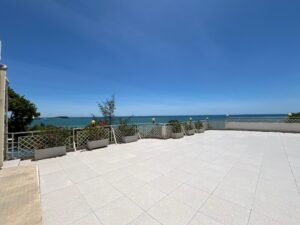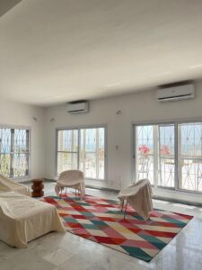 Vaste séjour ouvert sur une terrasse panoramique avec vue mer, cuisine minimaliste équipée d’un grand îlot central.Espace nuit