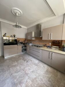 La cuisine principale, quant à elle, est entièrement équipée : four encastré, cuisinière, hotte et nombreux placards viennent faciliter le quotidien tout en assurant une finition sobre et pratique.