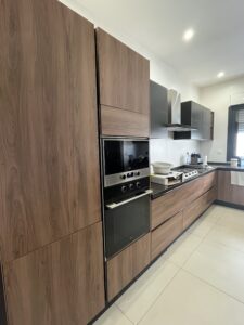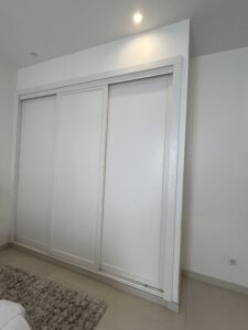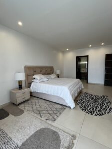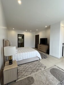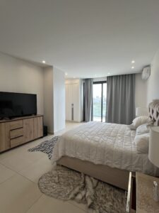 Les trois chambres sont toutes dotées de salle d’eau privative et de placards encastrés, avec une attention particulière portée à la chambre principale qui bénéficie d’espaces de rangement supplémentaires. Un couloir astucieusement aménagé offre encore plus de rangements intégrés. Une chambre avec salle d’eau est également dédiée au personnel.