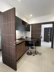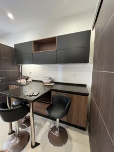 Dès l’entrée, un vaste séjour baigné de lumière s’ouvre sur deux balcons : l’un côté salon et l’autre côté cuisine, reliés à la chambre principale qui donne sur la rue. L’espace salle à manger, distinct, complète harmonieusement cette pièce à vivre. La cuisine, entièrement équipée (réfrigérateur, four, micro-ondes, vaisselle…), dispose d’un balcon, d’une buanderie et d’une porte de secours.